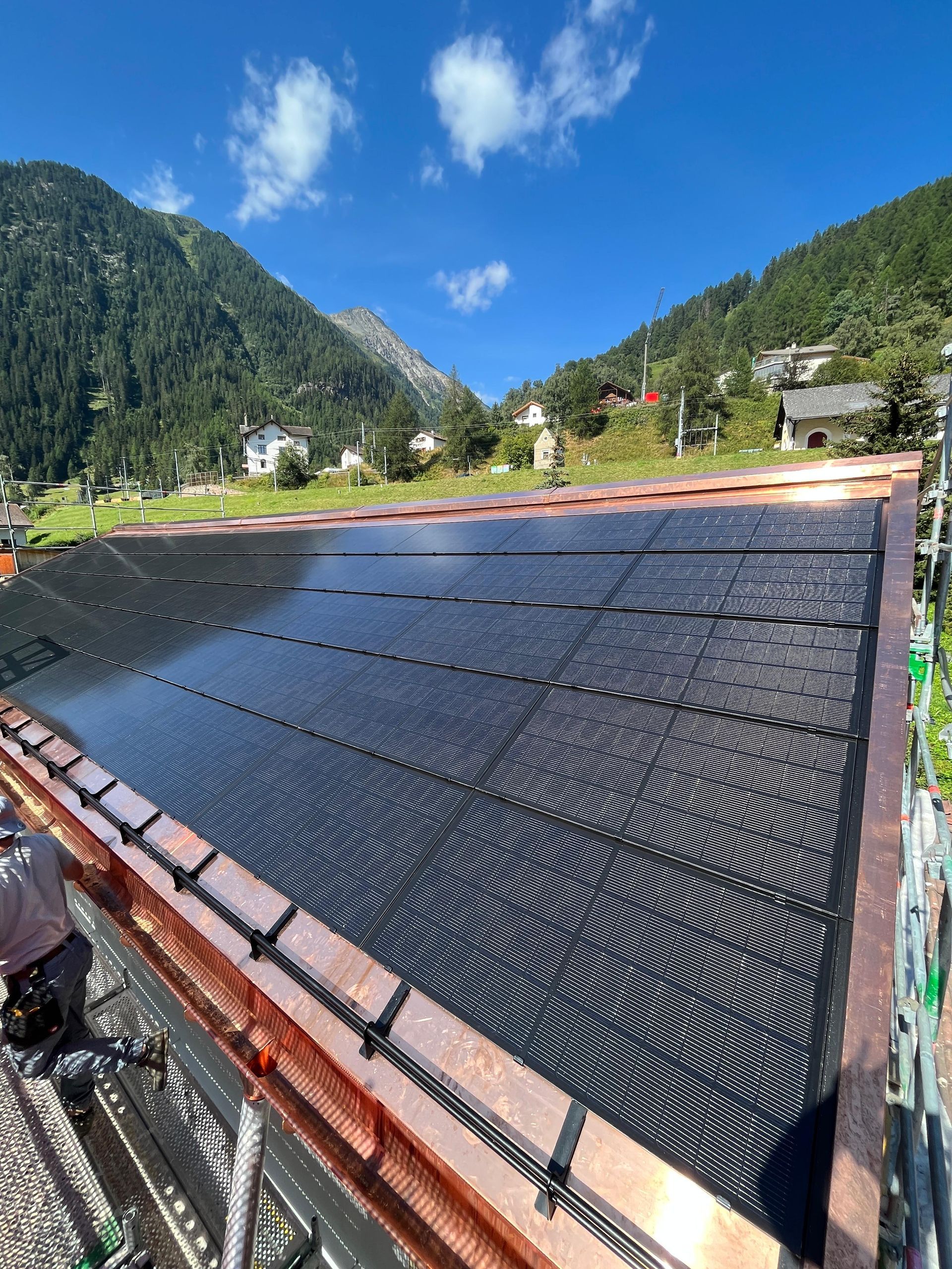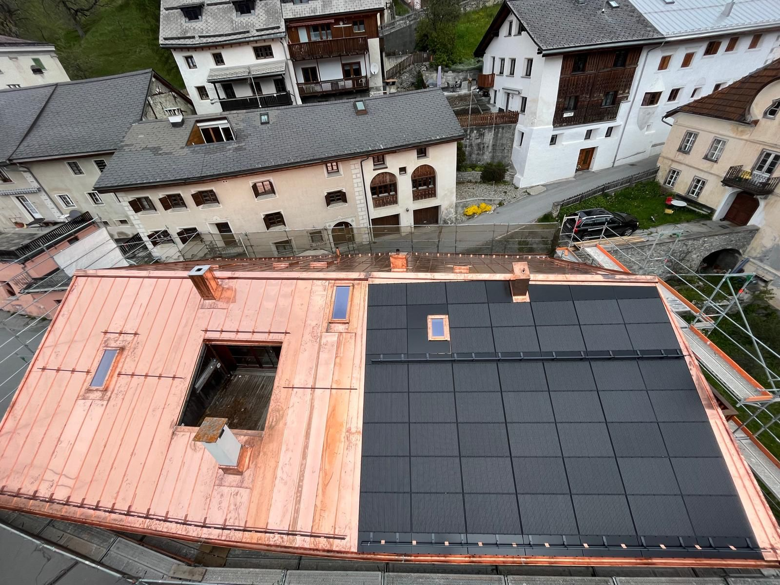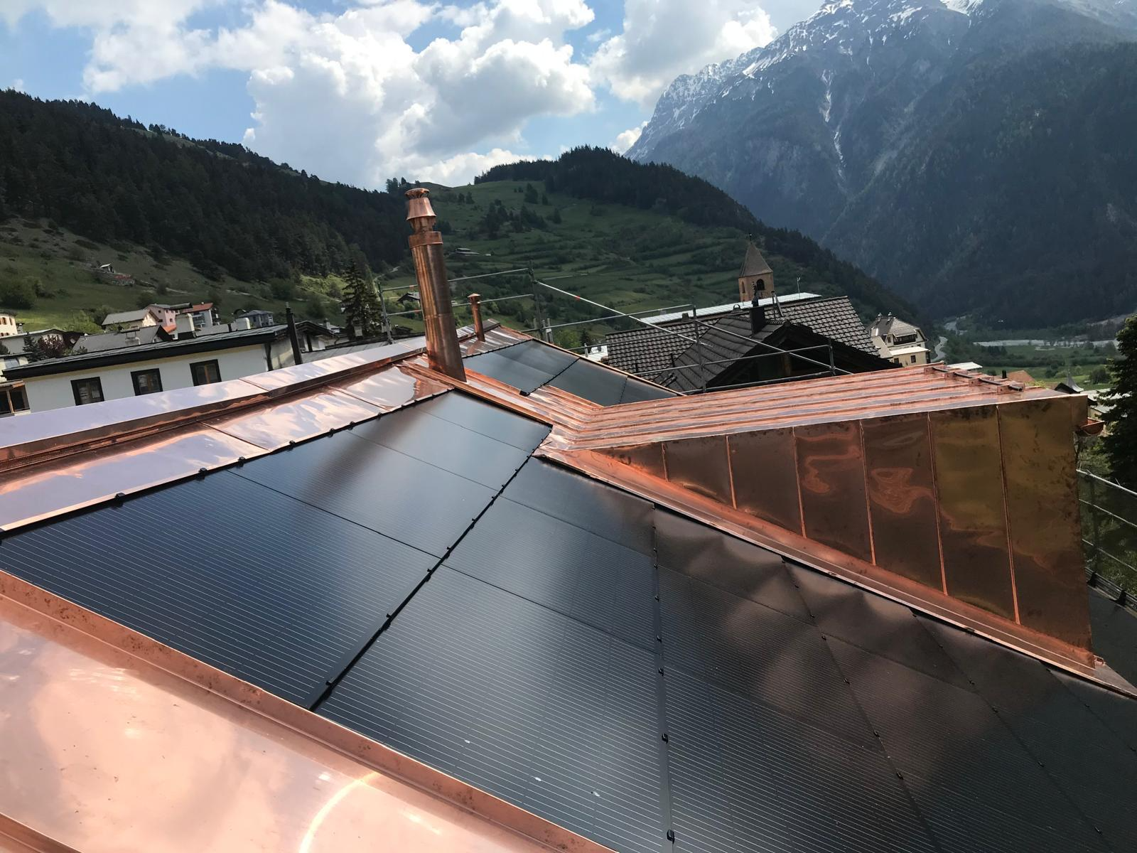 Photovoltaik – Die Zukunft direkt auf Ihrem Dach. Benderer Bedachungen installiert modernste Solarpanels, die direkt und nahtlos in Ihr Dach integriert werden. Unsere innovativen Photovoltaiklösungen sind nicht nur technisch auf dem neuesten Stand, sondern auch besonders leicht – es sind keine schweren Unterkonstruktionen oder aufwändige Montagesysteme notwendig. Doppelte Einsparung – Energie und Material. Der große Vorteil: Sie sparen nicht nur langfristig Stromkosten, sondern auch bei den Dachmaterialien. Unsere Solarpanels übernehmen gleichzeitig die Funktion der Dacheindeckung – das bedeutet weniger Materialeinsatz und geringere Baukosten. Ästhetik trifft Funktion. Unsere integrierten Solarlösungen passen sich harmonisch jeder Architektur an – sei es ein modernes Haus oder ein traditionelles Gebäude im Engadiner Stil. Die flache, elegante Optik sorgt für ein ästhetisches Gesamtbild ohne sichtbare Technik oder störende Elemente. Nachhaltigkeit mit Stil. Mit einer Photovoltaikanlage von Benderer Bedachungen investieren Sie in eine nachhaltige Zukunft, steigern den Wert Ihrer Immobilie und genießen gleichzeitig eine hochwertige, stilvolle Dachlösung. Jetzt beraten lassen – wir freuen uns auf Ihr Projekt