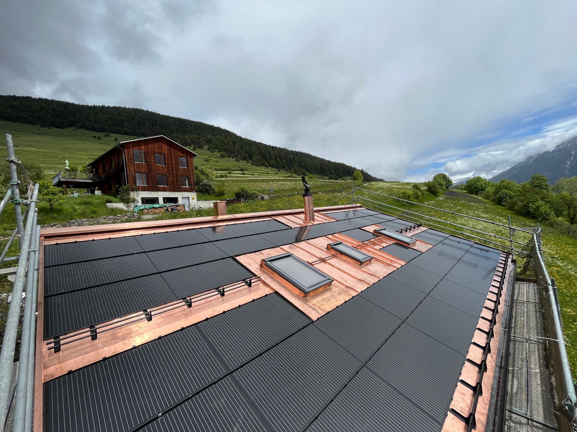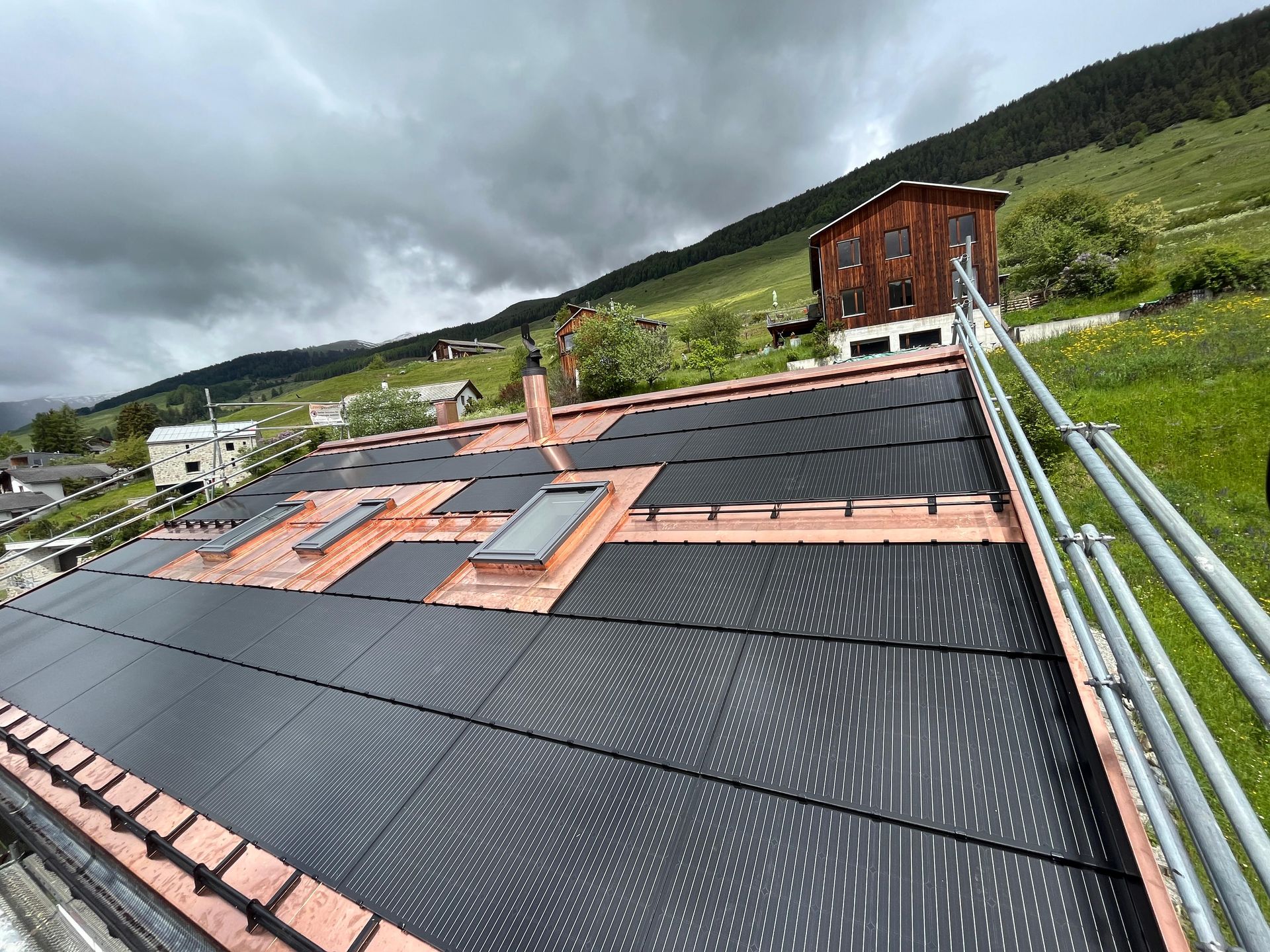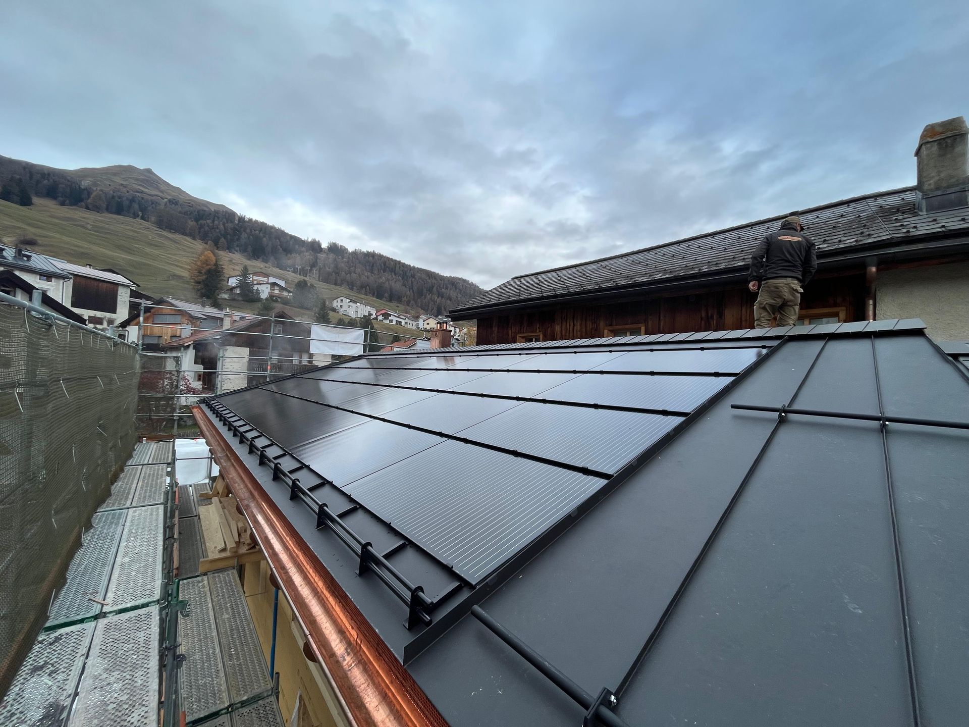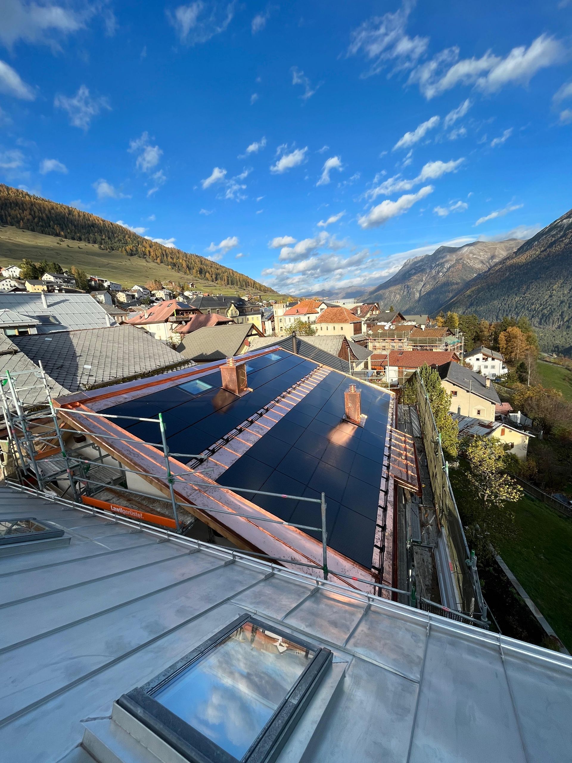 Photovoltaik – Die Zukunft direkt auf Ihrem Dach. Benderer Bedachungen installiert modernste Solarpanels, die direkt und nahtlos in Ihr Dach integriert werden. Unsere innovativen Photovoltaiklösungen sind nicht nur technisch auf dem neuesten Stand, sondern auch besonders leicht – es sind keine schweren Unterkonstruktionen oder aufwändige Montagesysteme notwendig. Doppelte Einsparung – Energie und Material. Der große Vorteil: Sie sparen nicht nur langfristig Stromkosten, sondern auch bei den Dachmaterialien. Unsere Solarpanels übernehmen gleichzeitig die Funktion der Dacheindeckung – das bedeutet weniger Materialeinsatz und geringere Baukosten. Ästhetik trifft Funktion. Unsere integrierten Solarlösungen passen sich harmonisch jeder Architektur an – sei es ein modernes Haus oder ein traditionelles Gebäude im Engadiner Stil. Die flache, elegante Optik sorgt für ein ästhetisches Gesamtbild ohne sichtbare Technik oder störende Elemente. Nachhaltigkeit mit Stil. Mit einer Photovoltaikanlage von Benderer Bedachungen investieren Sie in eine nachhaltige Zukunft, steigern den Wert Ihrer Immobilie und genießen gleichzeitig eine hochwertige, stilvolle Dachlösung. Jetzt beraten lassen – wir freuen uns auf Ihr Projekt